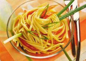 Тайёрланиши: 10 стакан сувга 1 қошиқ туз солиб қайнатилади. Макаронлар сингдирилмасдан қайнаган сувда пиширилади. Қайнаган макаронлар совуқ сувга солиниб тезда сузиб олинади. Сўнг қозонга бир қошиқ ёғ солиниб эритилади. Макаронлар ёғга солиниб яхшилаб аралаштирилади. Шундан сўнг помидорларнинг пўсти арчилиб, майдалаб тўғралади. Саримсоқ бўлакчалари ҳам майдаланади. Қолган 2 қошиқ ёғ товага солиниб, помидор ва майдаланган саримсоқ 15 дақиқа давомида пишириб олинади. Ёғланган макаронлар ликопчага солиниб, устига помидорли соус қуйилади. Кўкатлар ва пишлоқ билан безатилиб, дастурхонга тортилади.