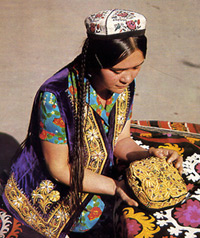 Тахмондаги кўрпачаларни олиб сандиқни очсам, оқ матога ўралган дўппи сандиқ ичида тугунлар устида турган экан. Уни бувимга узатдим. Бувим матони очиб, дўппини авайлаб силади ва бир энтикиб қўйди. Ёшлик даври ёдига тушдими, дўппига узоқ термулиб қолди. Сўнгра чевара қизларига қараб, "мана шуни бирортангиз кийсангиз-чи, яп-янги турибди, янги келинлик пайтимда кийганман", деди қўлидаги нақшинкор дўппига ишора қилиб.