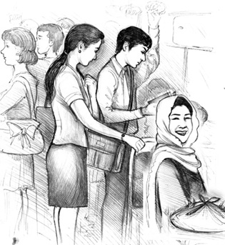 Шу аснода сергул матодан тикилган дастурхонга тугилган катта саватни бошига қўйган бир аёл автобусга яқинлашди.
